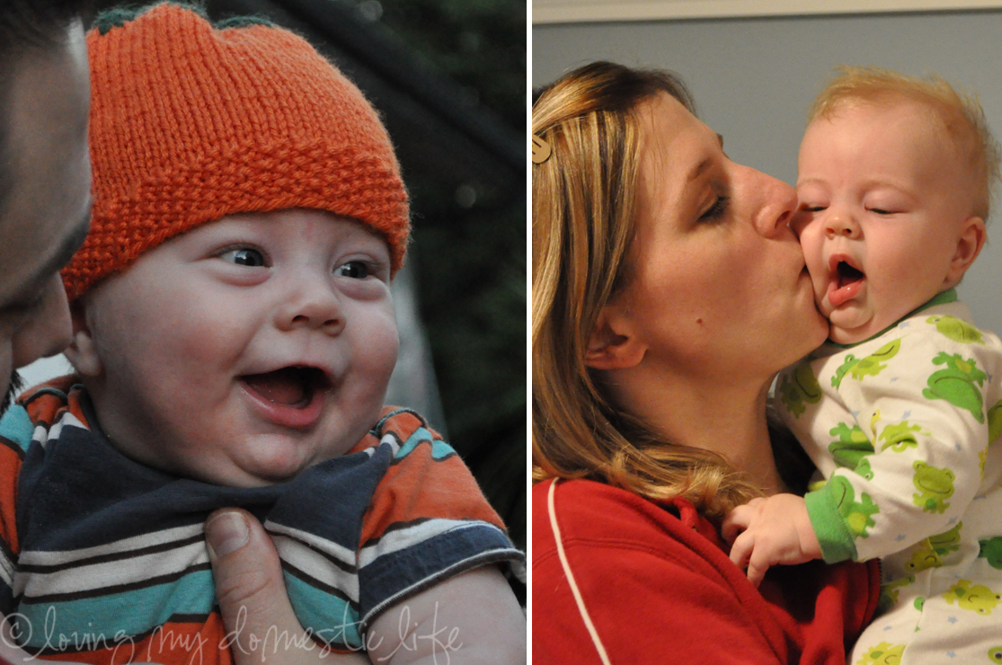 I can't believe my sweet little boy is 4 months old today! Where have these last three and half months gone?!?! He is still nursing like a champ. I don't know exactly how much he weighs at this point (his check up is next Tuesday), but I am guessing he is around 20 pounds. He was just over 17 at his last appointment and that was about 5 weeks ago, so that is my best guestimate of where he is at currently. He has started rolling over (front to back) and his index and middle fingers are his favorite to munch on. Both hands. At once. Cutest little chubby fisted boy if I ever did say so myself!